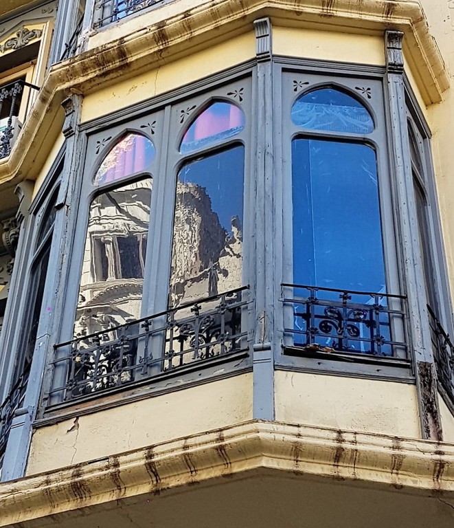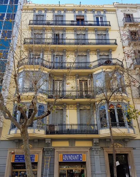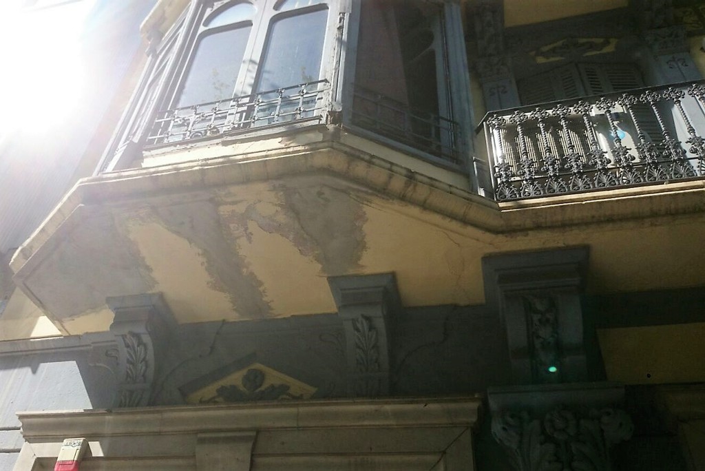 Fachada calificada en catálogo de Barcelona, con patologías diversas en cornisas, pavimentos de balcones y carpintería.