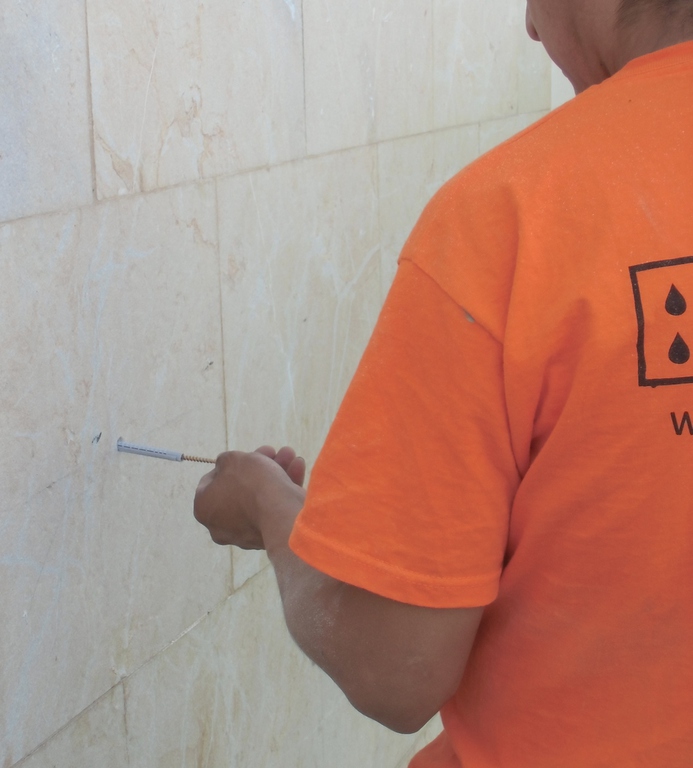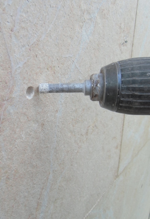 Formación de agujeros en la piedra "Cenia" por parte de operarios especialistas con broca diamontada en seco y sin percusión para no romperlas