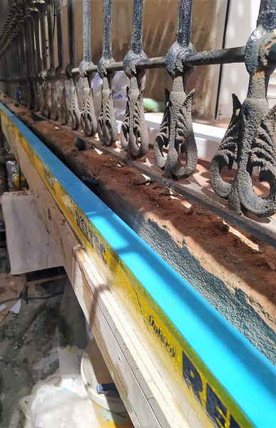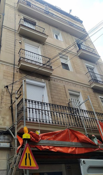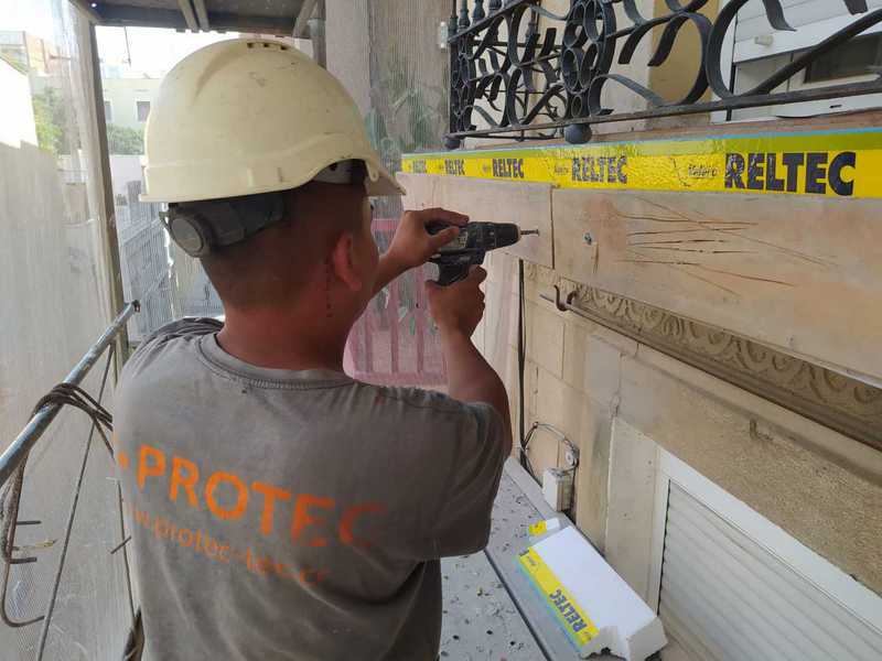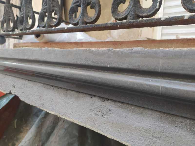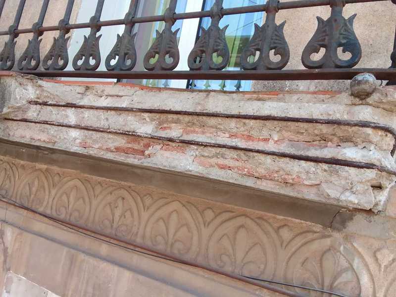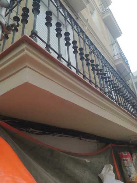 Reparación de cantos y debajo de balcones, con la colocación de molduras de EPS plastificadas aplantilladas a medida original, con mortero